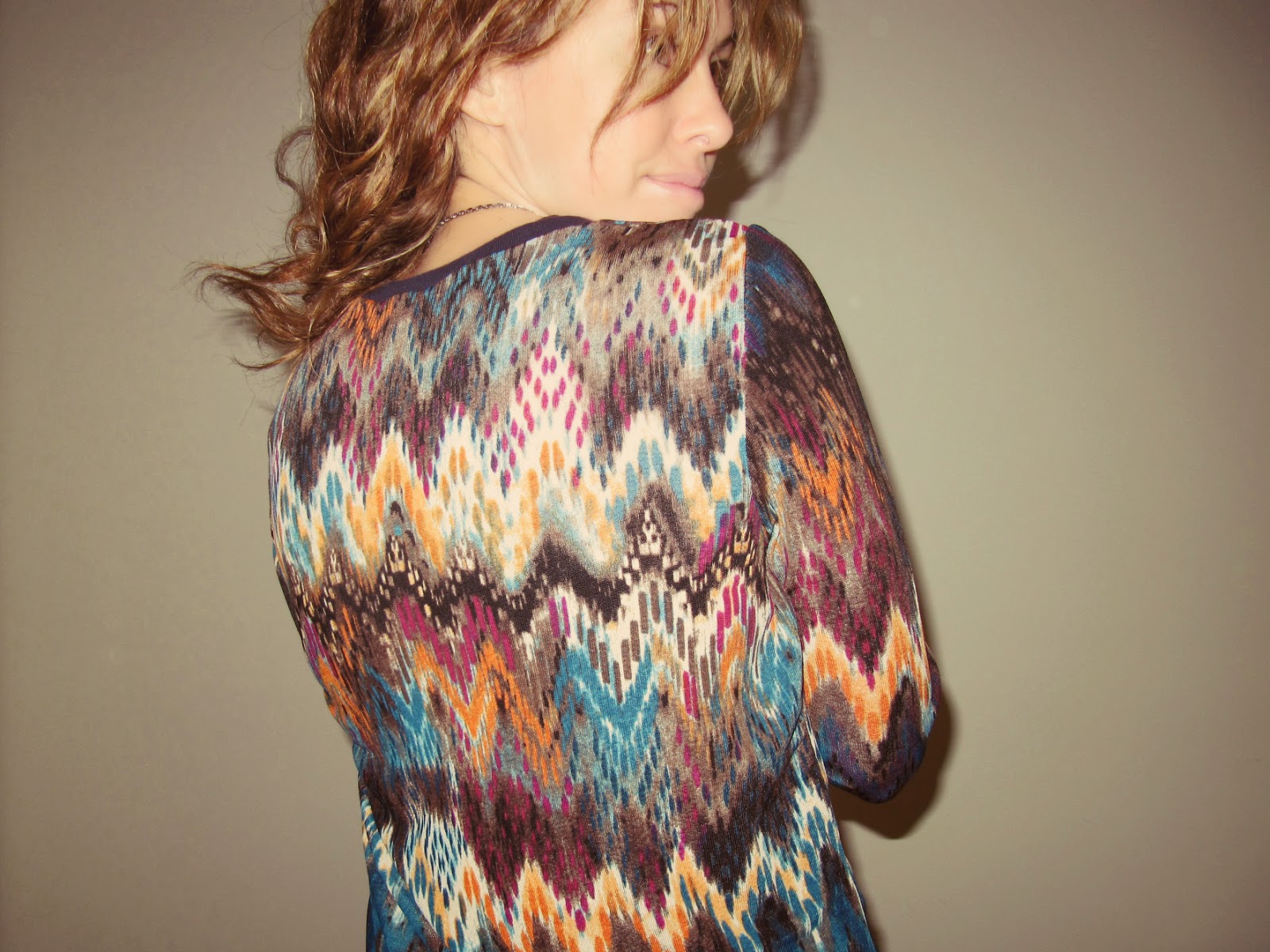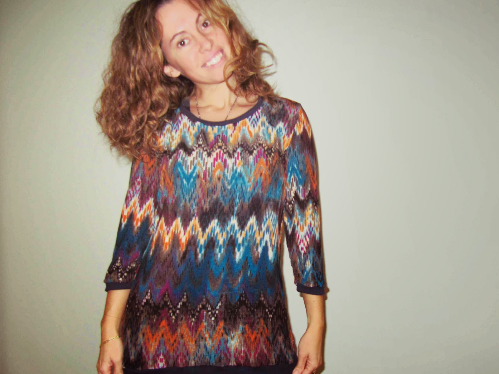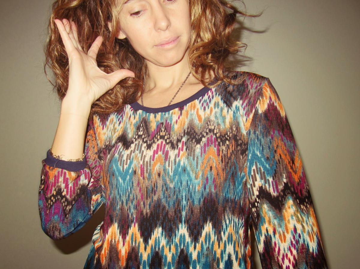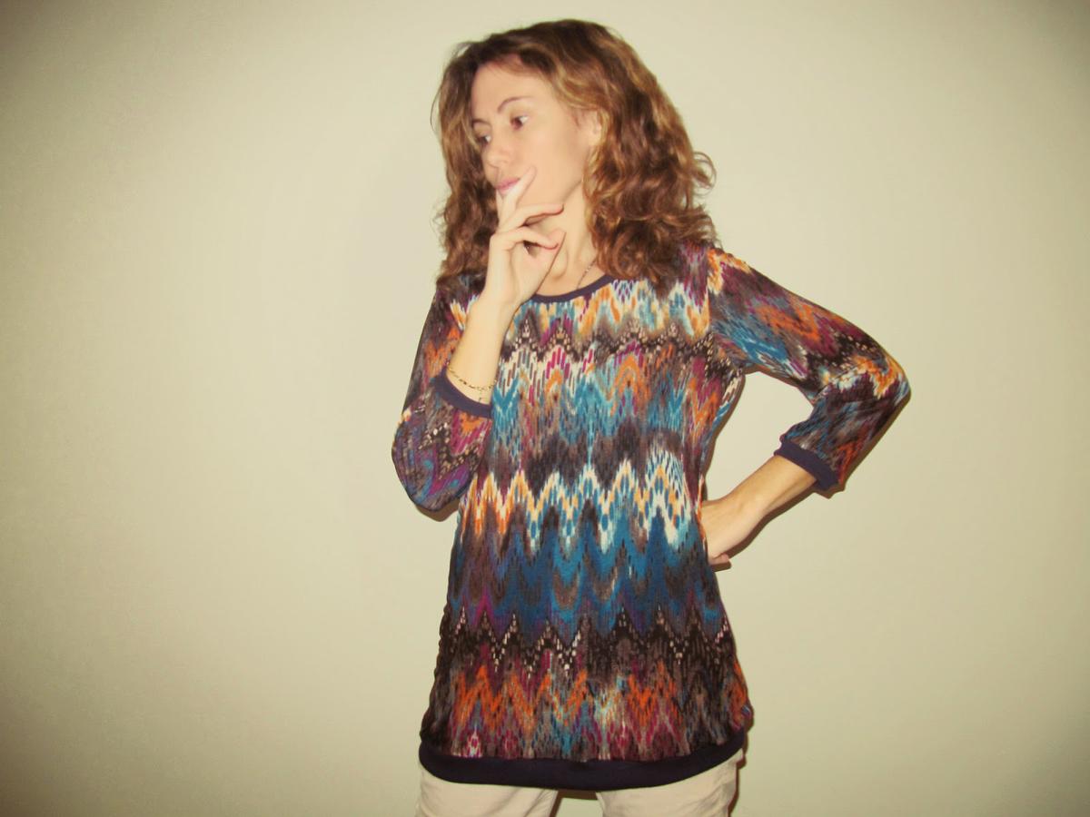 El estampado me encanta... y pese a todo su colorido, la veo muy combinable. En los puños y cuello un punto acanalado azul marino.