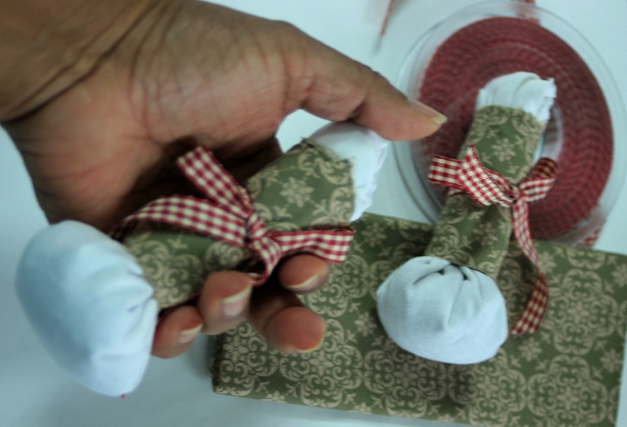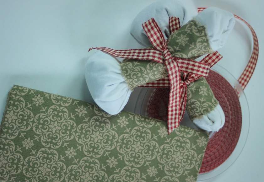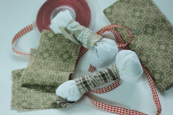 Simplemente se toman un buen puñado de hierbas aromáticas secas, un pedazo de tela de algodón y cinta también de tela y se forma esta especie de "bolos" o bastones