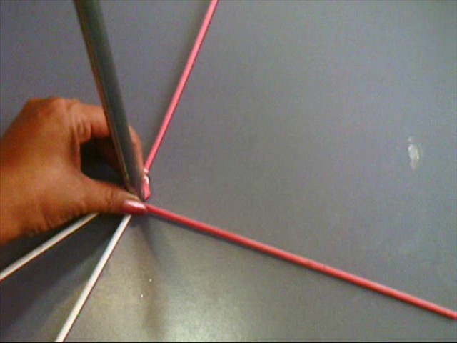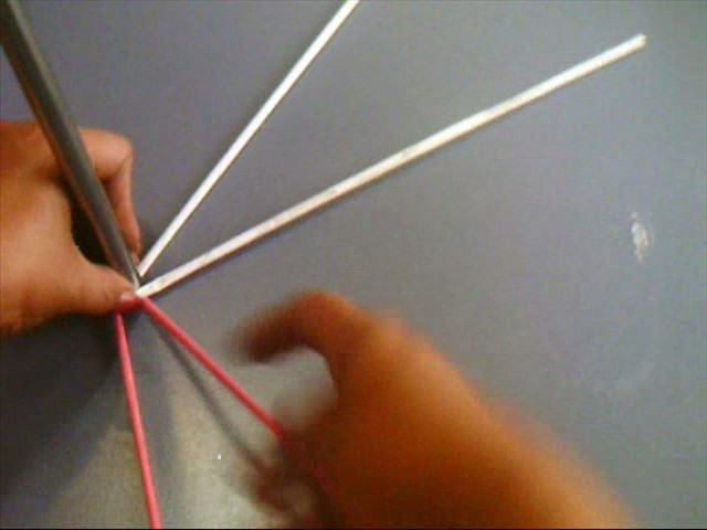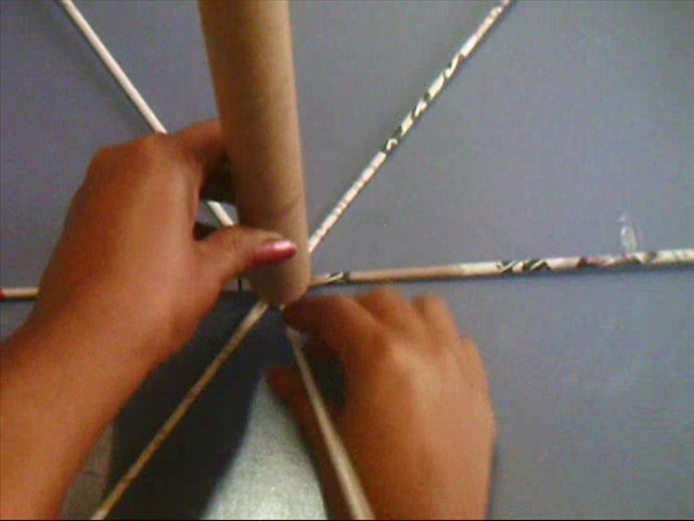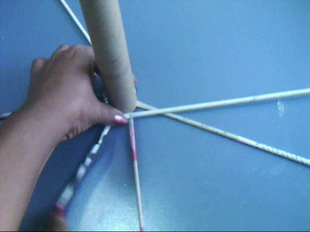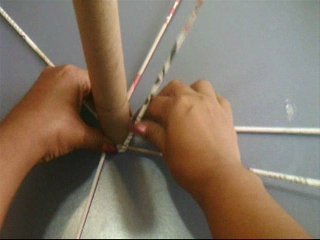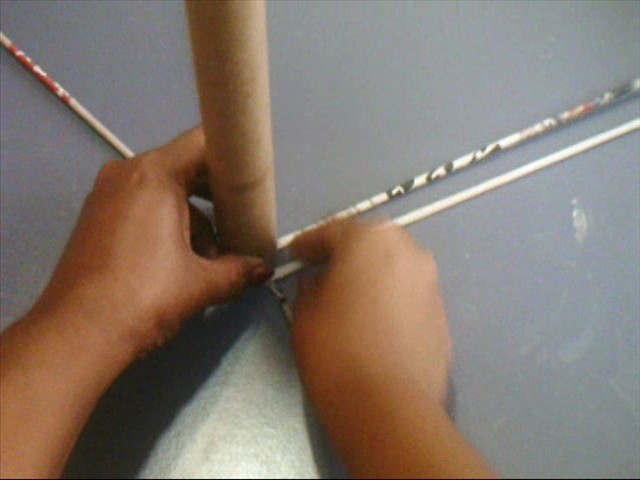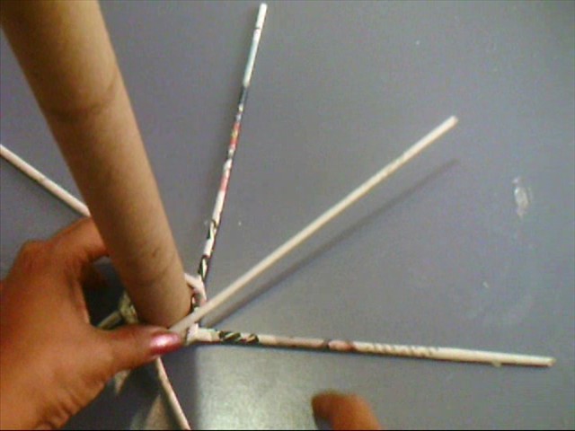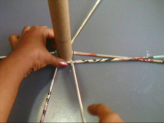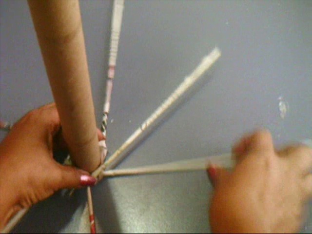 Para un tubo de aproximadamente 10 centímetros de circunferencia (poco más o poco menos) utilizamos tres varillas de papel y las pegamos en forma de cruz... Centramos el tubo, tomamos cualquiera de las varillas...