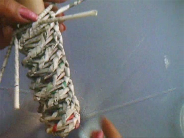 Este tejido en espiral es muy flexible, pero tenemos que forzar a que se quede fija la curva del bastón, para eso, utilizamos un hilo o cordón resistente, el que vamos a insertar abriendo un poco el tejido casi al final del extremo del bastón... luego ese mismo hilo lo vamos a introducir también a la misma altura del bastón formando la curvatura, amarramos firmemente... Así amarrado, vamos a pintar y dar dos capas de barniz, y ya que esté seco, cortamos los hilos, la curvatura se quedará fija...