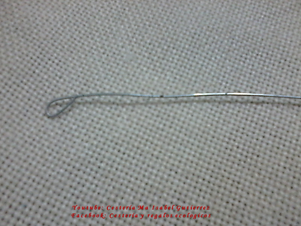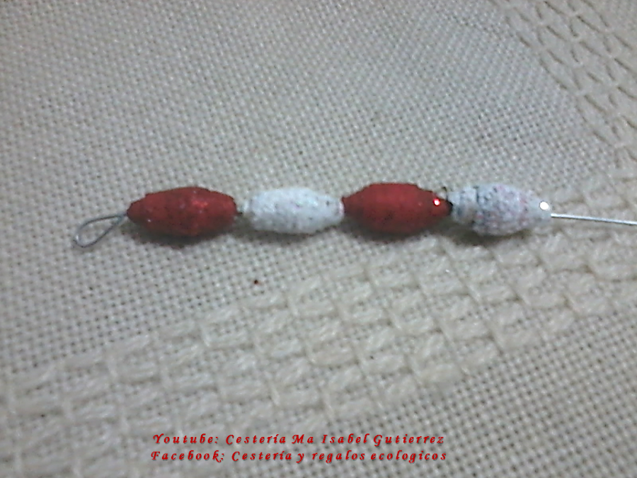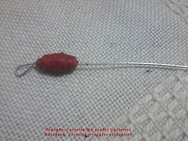Cortamos tramos de alambre del tamaño que deseamos los bastones, hacemos un gancho pequeño en un extremo, de manera que no se puedan salir las cuentas...