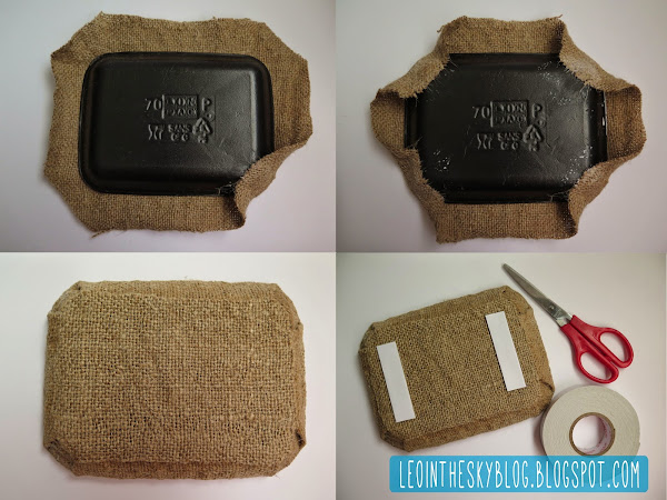 Lo primero de todo es cortar un trozo de tela lo bastante grande como para cubrir el frontal de la bandeja y los bordes de la misma. Aplicamos cola abundantemente (sobre todo si se trata de tela de saco como la mía) y pegamos la tela. Le damos la vuelta a la bandeja y vamos pegando las esquinas como se ve en la foto, esperamos a que se seque la cola y recortamos un trozo más de tela para tapar la base. Una vez seca la cola (yo lo dejé toda la noche) pegamos dos trozos de cinta de doble cara para sujetar nuestro marco.