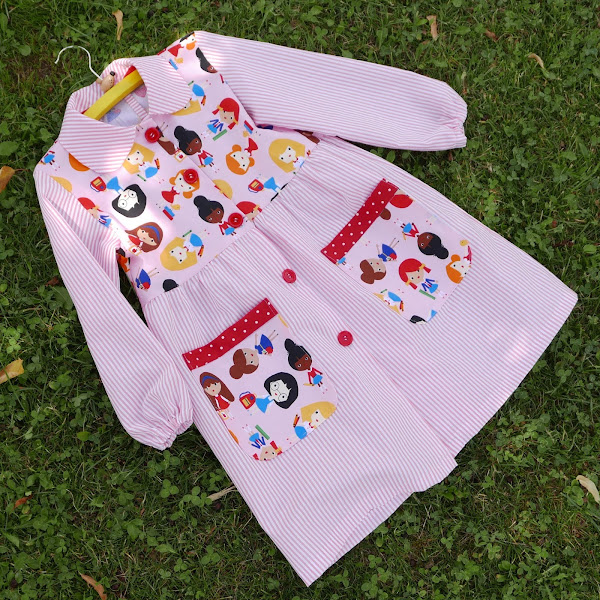 Bata escolar School Smock: La bata clásica, unisex, en tallas de 2 a 7 años. Una bata con cuello, canesú, bolsillos y abotonadura delantera. Seguro que te resultará más fácil de lo que parece hacerla, si tienes curiosidad puedes ver el videotutorial para hacer la bata de colegio, que acompaña el patrón.