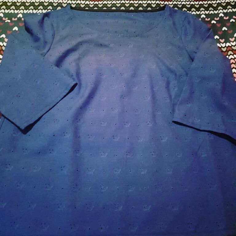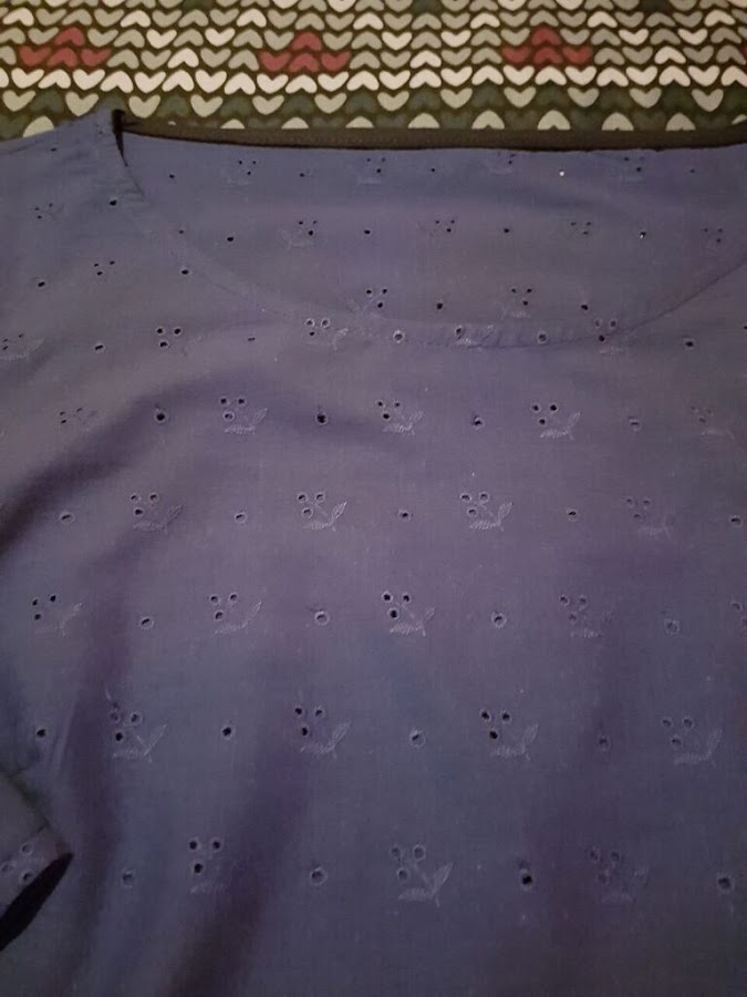 En esta foto se aprecia bien el bordado del tejido y el escote pulido con cinta al bies de algodon de color azul.