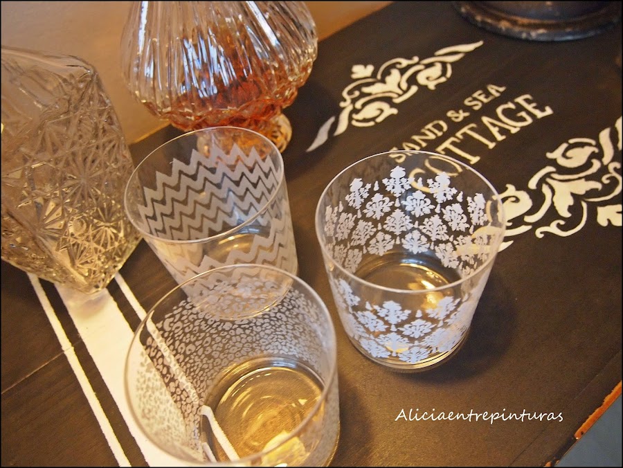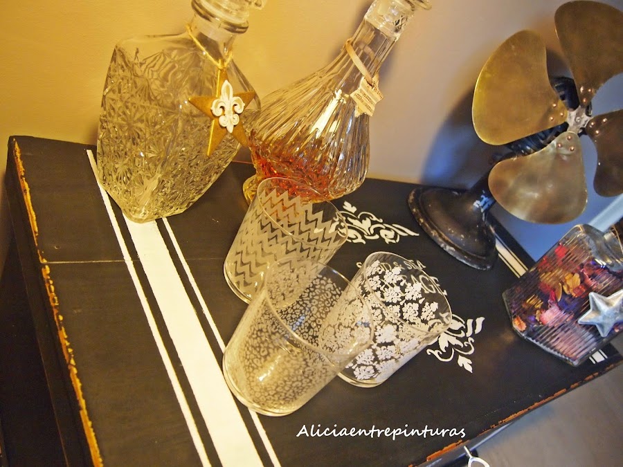 Como veis solo han variado las plantillas utilizadas. Fondo negro con pintura al agua mate y decorado con estarcido en blanco.