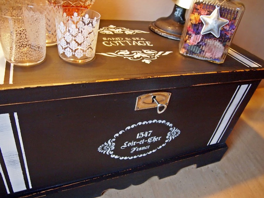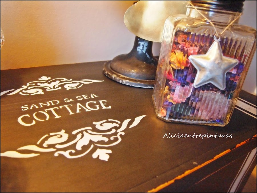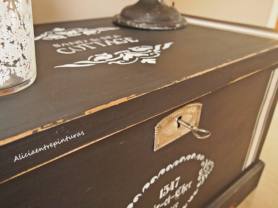 He ido intercalando diversas plantilla de Decovintage, y para finalizar dos manos de cera para proteger y darle un brillito natural.