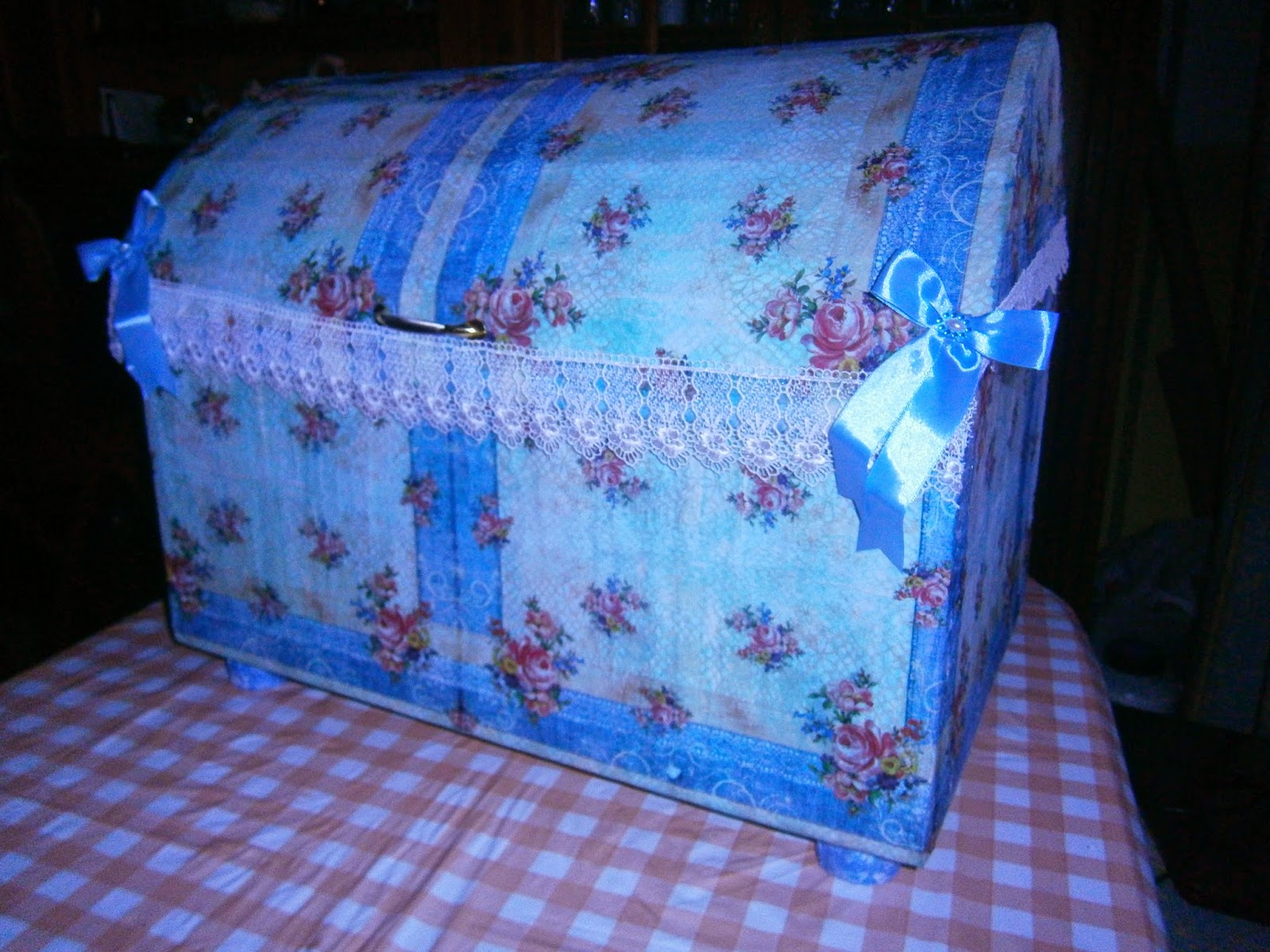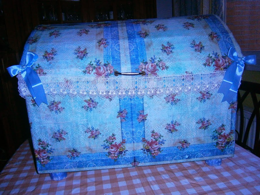 Hola a tod@s, hoy os muestro un baul que le he hecho a la novia de uno de mis hijos, se lo había prometido y por unas cosas y otras hasta estas navidades no lo pude hacer, esta hecho de cartón y decorado con servilletas, a mi me parece que ha quedado genial y a ella le ha encantado y como siempre que puedo os muestro el proceso por si alguien se anima a hacerlo.