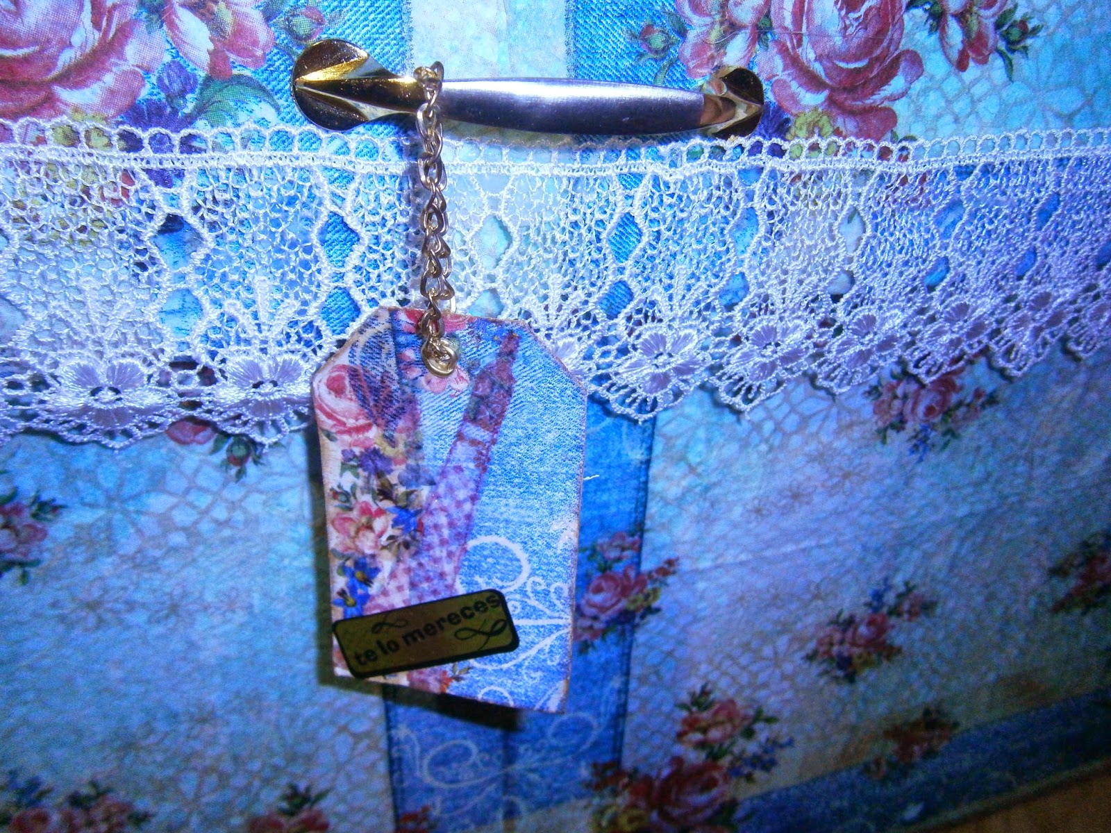 La decoración, con servilletas de papel y encajes y en la parte delantera unos lazos y unas perlitas y como detalle le hice una tarjeta (también de reciclado) que decoré con restos de servilletas y una pegatina que pone te lo mereces.