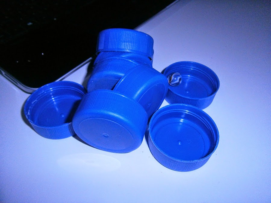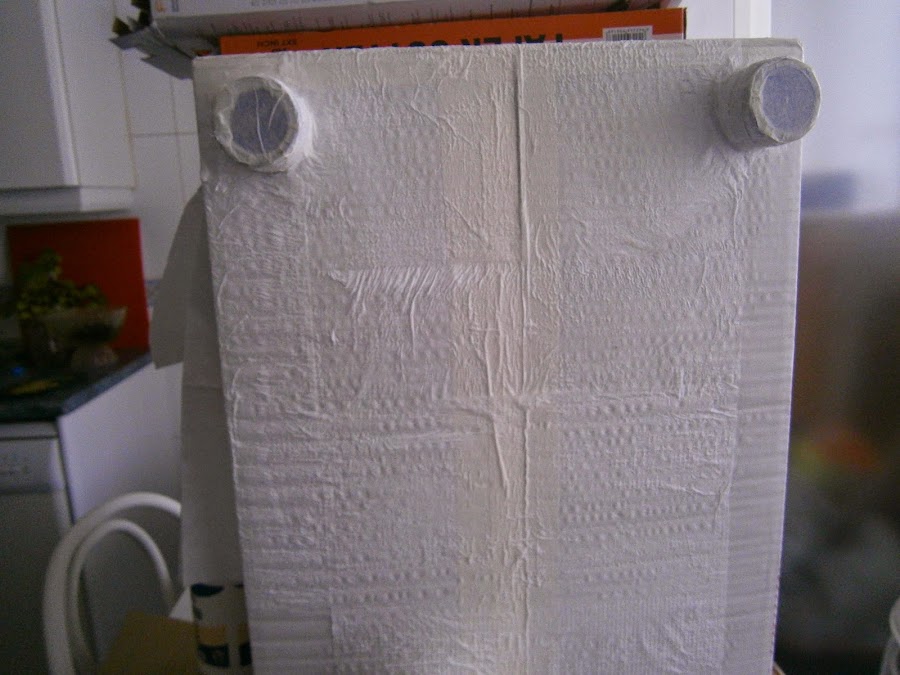 con un trozo de tela de algodón hice la bisagra.Estos son los tapones que use para las patas, simplemente pegue dos para cada pata y los uní al baul integrándolos con papel,