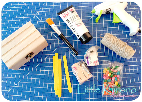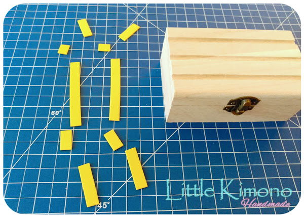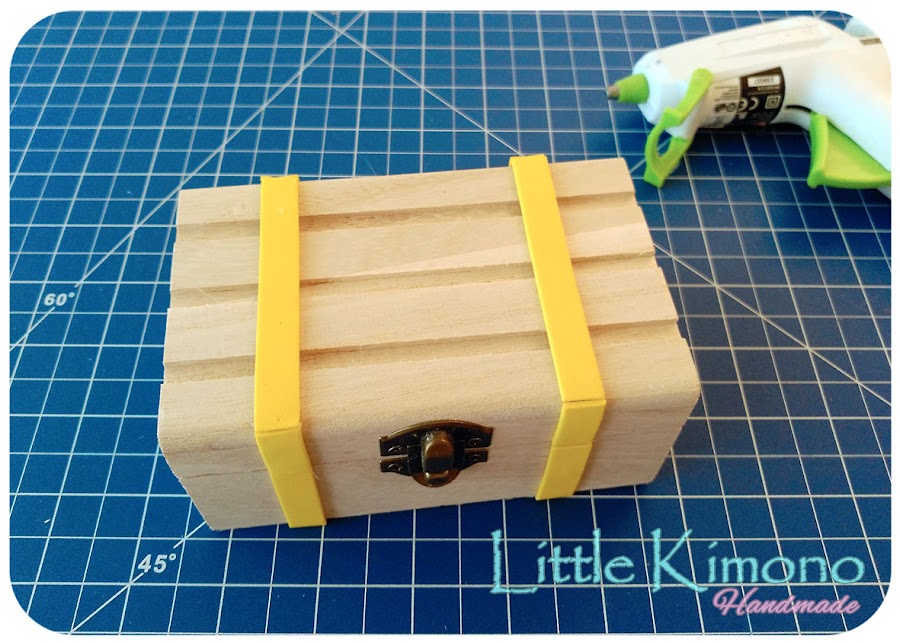 Paso a Paso: 1. Bueno mi cajita era un poco diferente a la suya, así que en mi caso lo primero fue pegar unos palitos de goma EVA en la caja para darle el aspecto de baúl, algunas cajas ya traen esta decoración pero como la mía no la traía las musas se pusieron a maquinar ^^