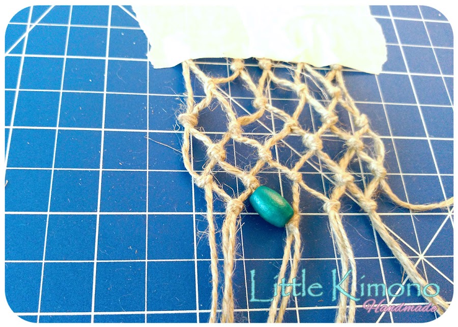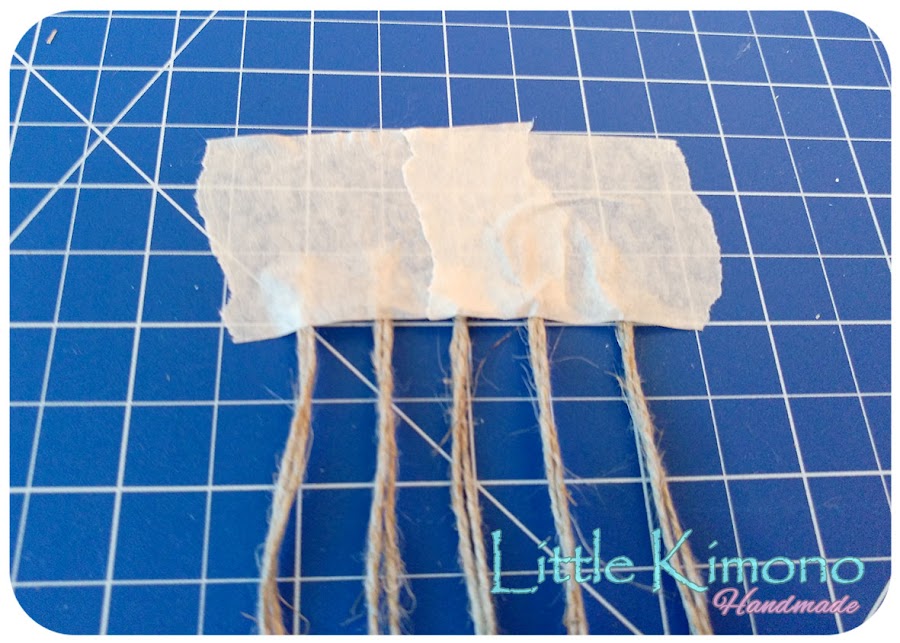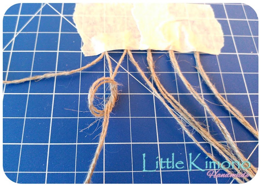 3. Llega la parte de crear la red de pesca para decorar la caja, cogemos cuerda de yute y cortamos 5 grupos de dos cuerdas, las sujetamos con un trozo de cinta de carpintero a la mesa de trabajo y vamos haciendo los nudos como muestran las imagenes ;)