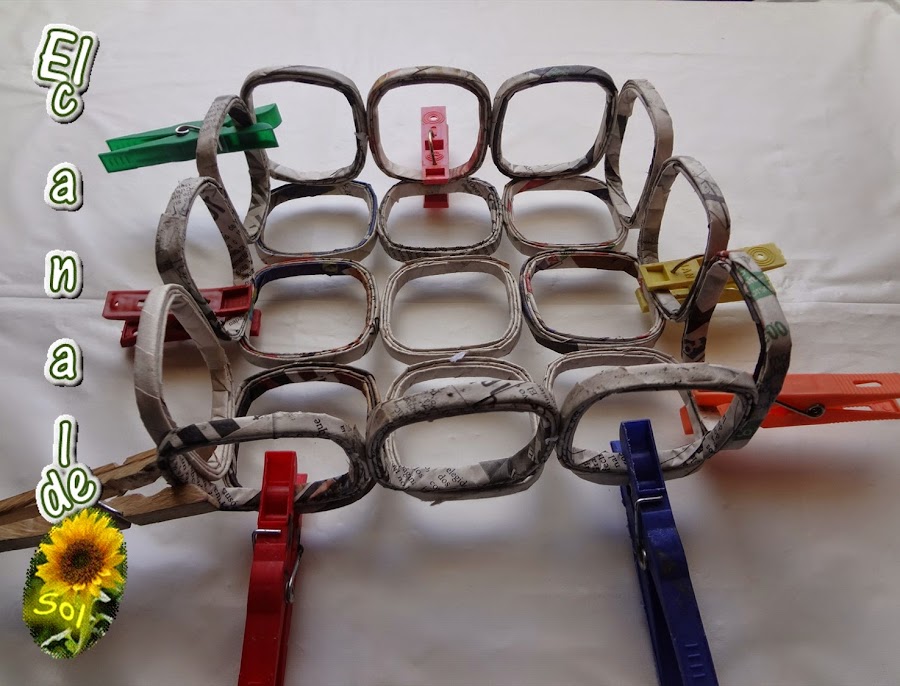 Cuando haya secado, tomaremos dos tubos de papel y los cruzaremos en cada fila de cuadros