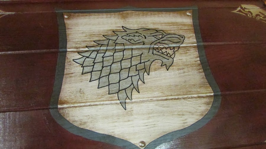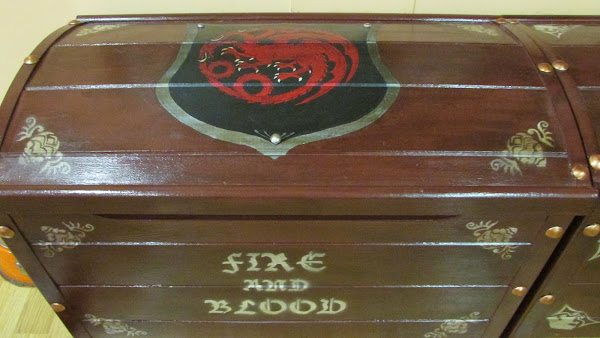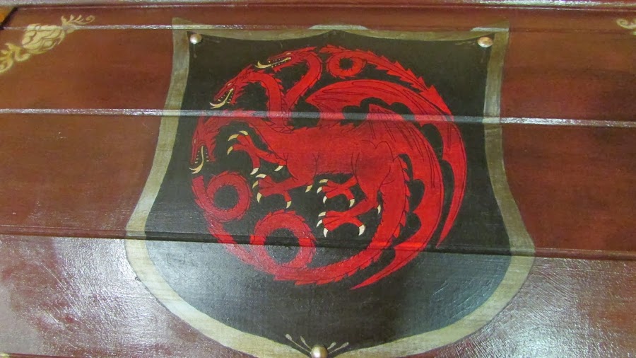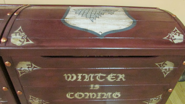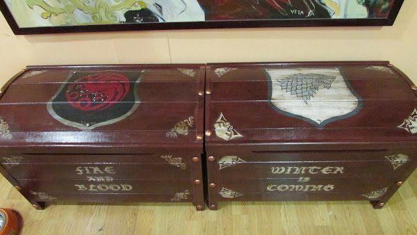 La idea me la dio ella, quería un baúl para su casa pero no encontraba ninguno asequible que le convenciera y decidió encargarme uno personalizado de juego de tronos. Como buena friki me encantó la idea aunque sabía que iba a ser muuy laboriosa, menos mal que contaba con la colaboración de mi hermana para darle capas y capas de pintura. Y es que lo que empezó siendo: bueno hacemos un baúl sencillo... se convirtió en : dos baúles grandecitos y currando hasta las 2 de la mañana... Pero el resultado mereció la pena: Mi amiga encantada con su regalo y ahora tiene una casa más bonita en la que presiden dos baúles de Juego de Tronos en los que guardar juegos frikis (como no podía ser menos).