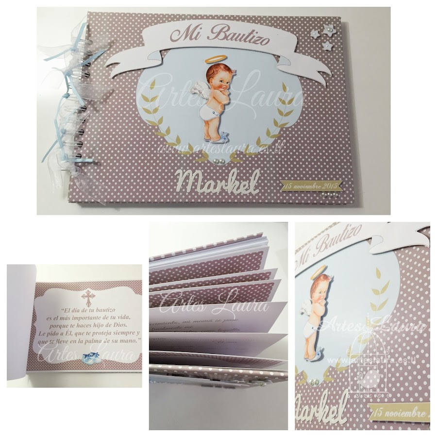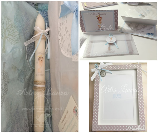 Le realizamos el libro de firmas, las tarjetas de agradecimiento con sus correspondientes sobres, la vela del bautizo personalizada y los porta fotos en los que se daría como recordatorio a la familia la foto del bebé.