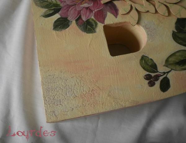 La tapa está decorada en decoupage y craquelado ( que tengo que practicarlo aún más por cierto)