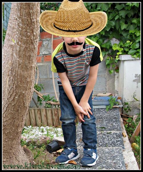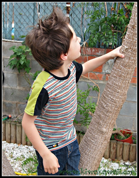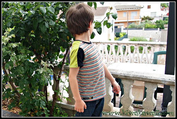 Para mi hijo mayor, la he cosido en la 116cm, con el delantero de rayas de colores de La Pantigana, y las mangas combinando negro y verde pistacho, de Cal Joan. Le añadí en el cuello una cinta con una estrella, de Hilos y Más, y una etiqueta Handmade abejita, del mismo sitio.