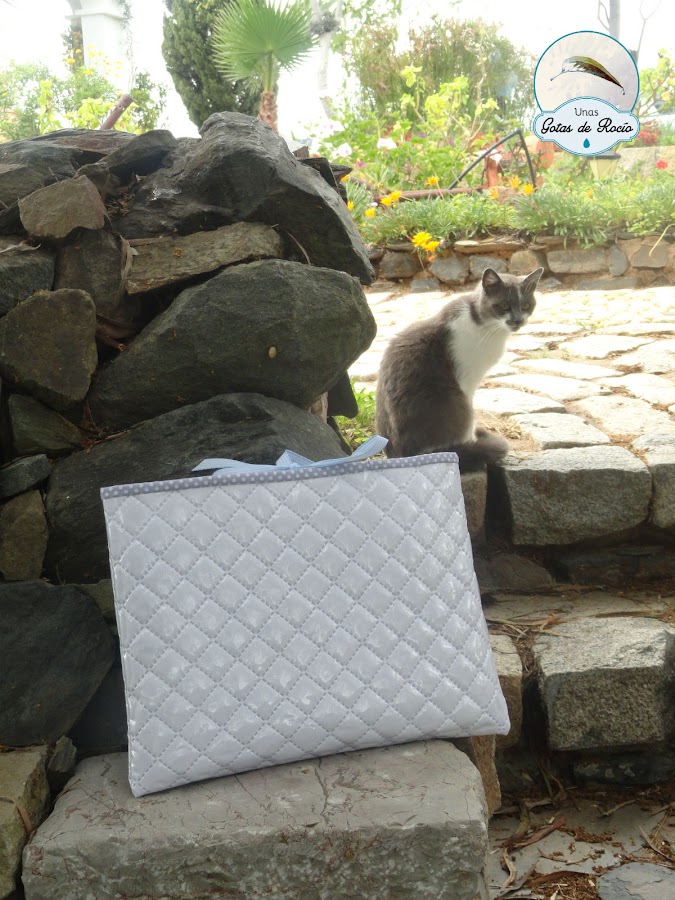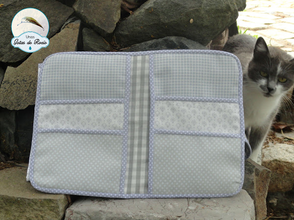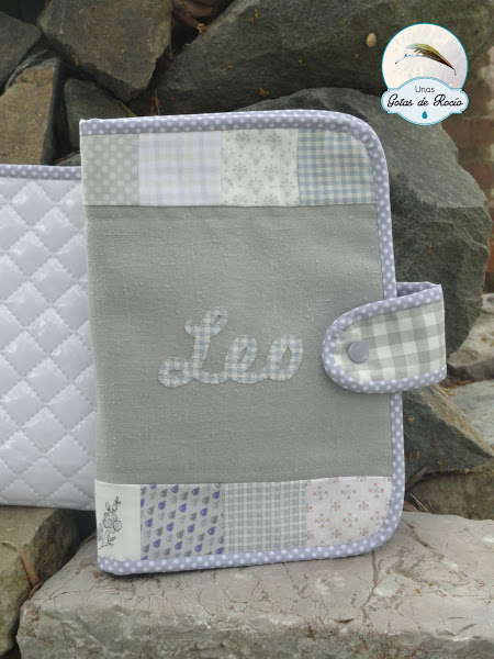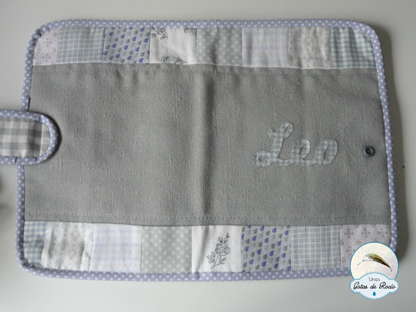 Recopilé telas grises y pensé que bien podía usar todas, que a la madre le gustaría y que a quien lo regalaba también. Aunque sé que está de moda el gris para los bebés, no deja de parecerme un tanto triste, la verdad, pero combinando varias telas mi visión del gris cambió y pienso que me ha quedado un portadocumentos muy bonito.