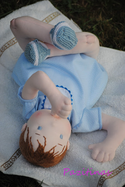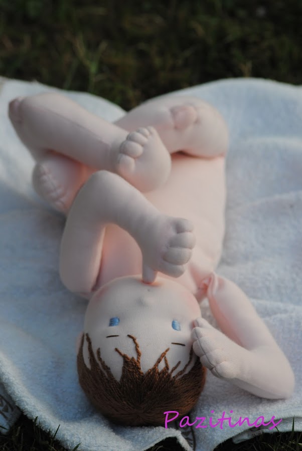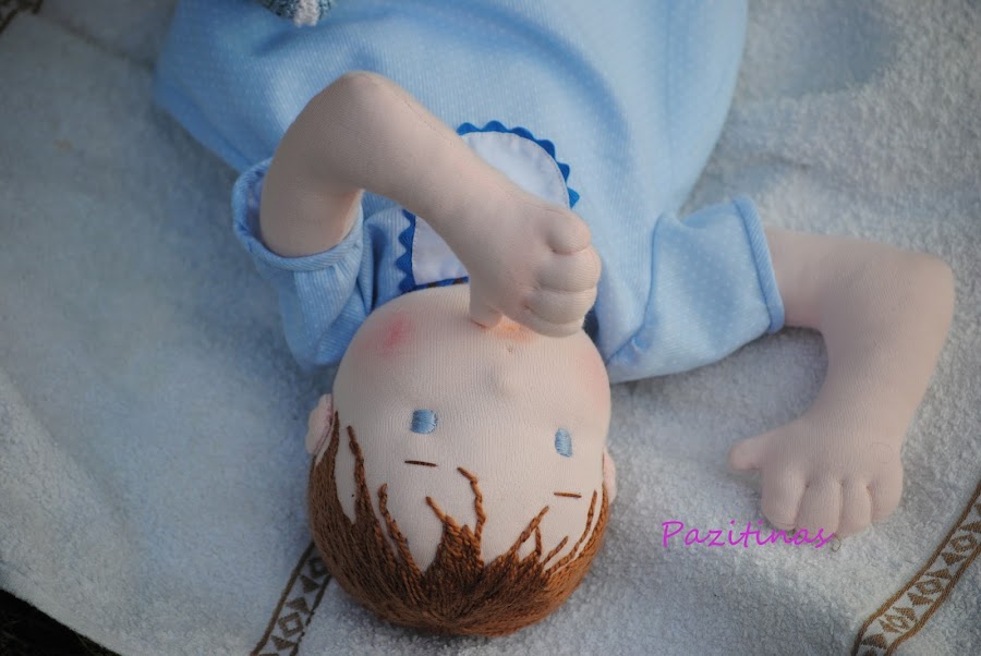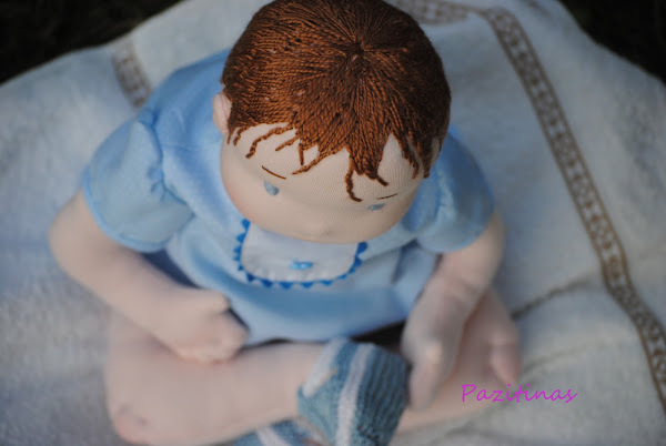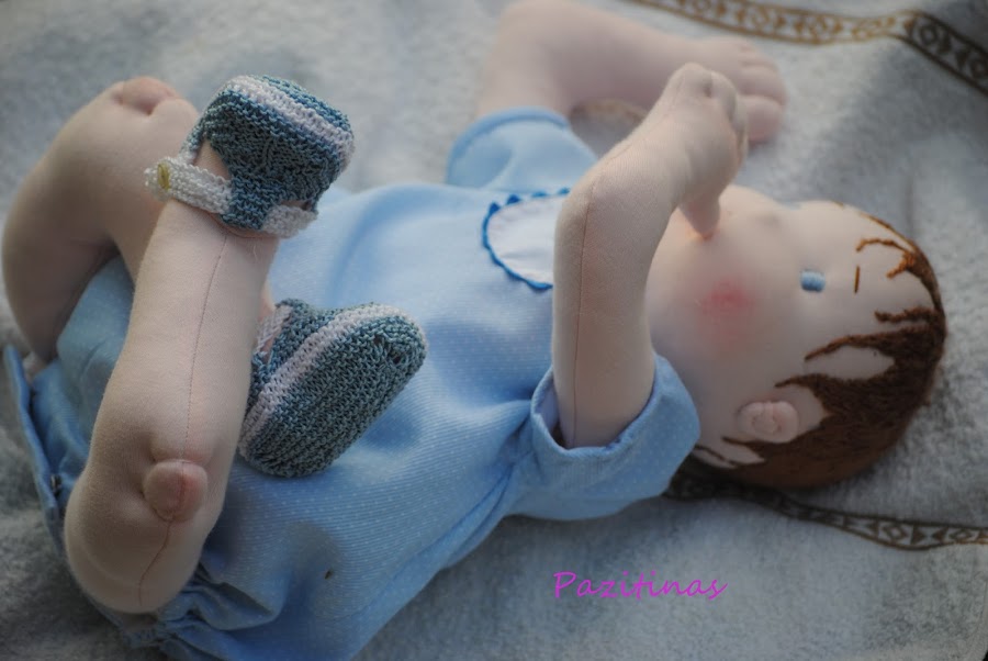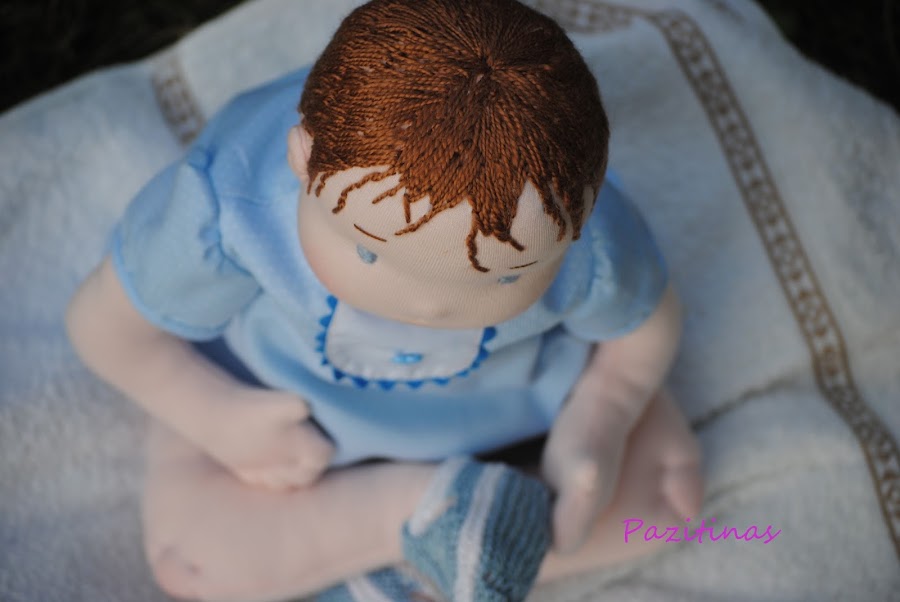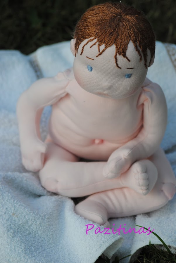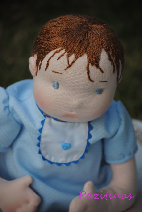 Muñeca de trapo waldorf, bebe confeccionado en punto de algodón, relleno de lana natural, pelo y cara bordada , pelele de algodon y patucos de punto , hecho a mano.