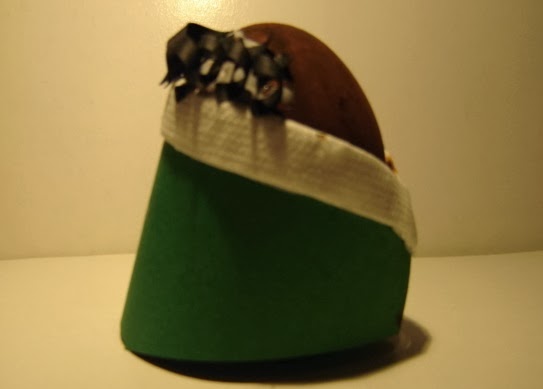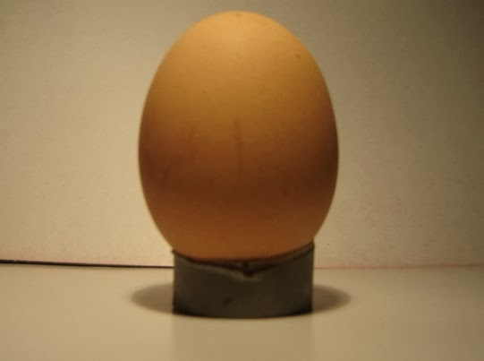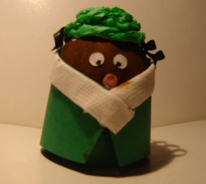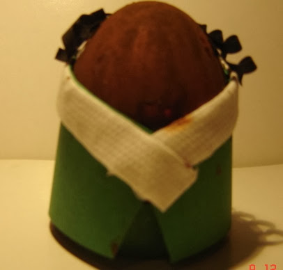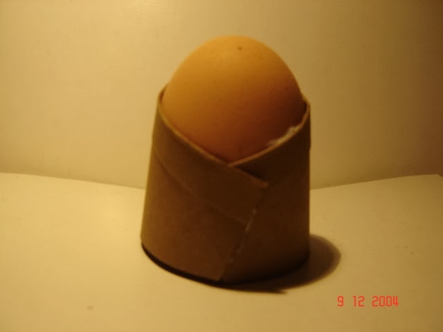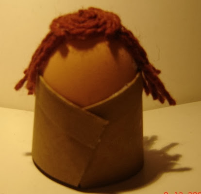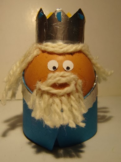 1º Para que los huevos tengan estabilidad, le pegamos un trozo de rollo de papel higienico. Antes pintamos de marron el huevo que luego sera Baltasar.