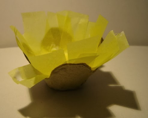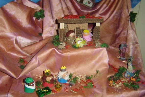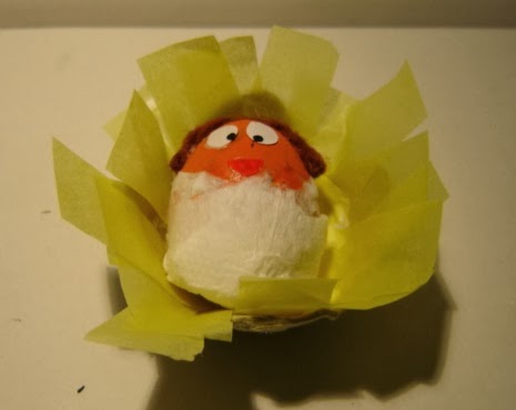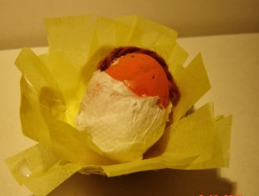 3º Para el niño Jesus Pinto un huevito de codorniz y con un trozo de carton de la huevera y papel de seda hacemos el pesebre.