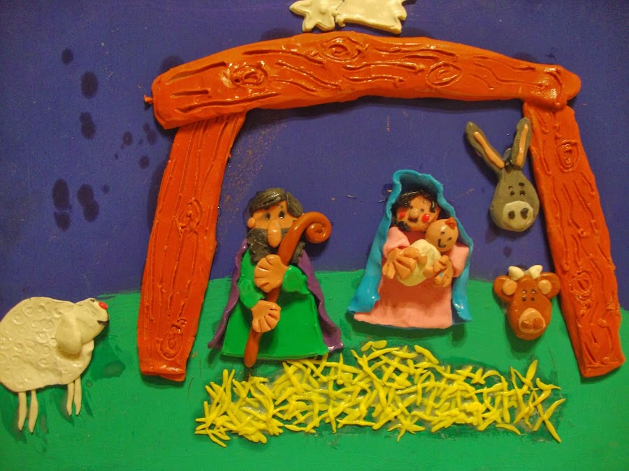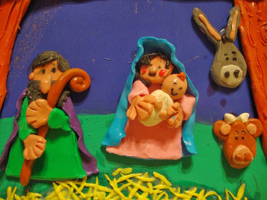 Las figuras están hechas con plastilina y barnizadas con alkil, pegadas sobre un tablés pintado.