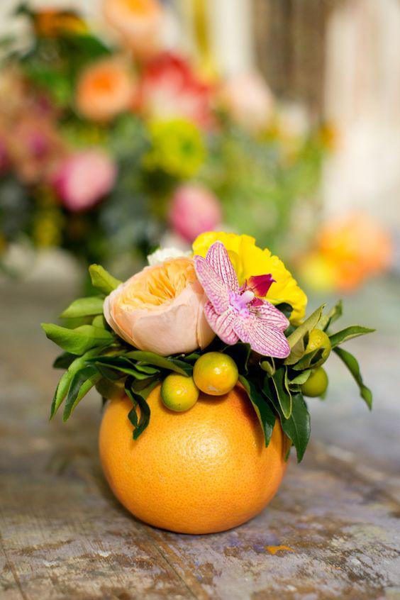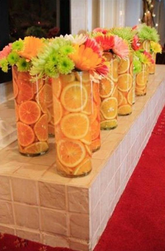En esta oportunidad quiero mostrarte muchas ideas de centros de mesa realizados con cítricos, limones, limas, naranjas y mandarinas. Podemos utilizarlas en rodajas, llenando jarrones o floreros transparentes; colocarlas en bandejas, bowls o cajones de madera decorados con hojas. Una buena idea es cortar las frutas a la mitad, insertarle un palito en la parte inferior y colocarlas entre flores formando un ramo muy interesante, o simplemente como contenedoras de velas o flores pequeñas.