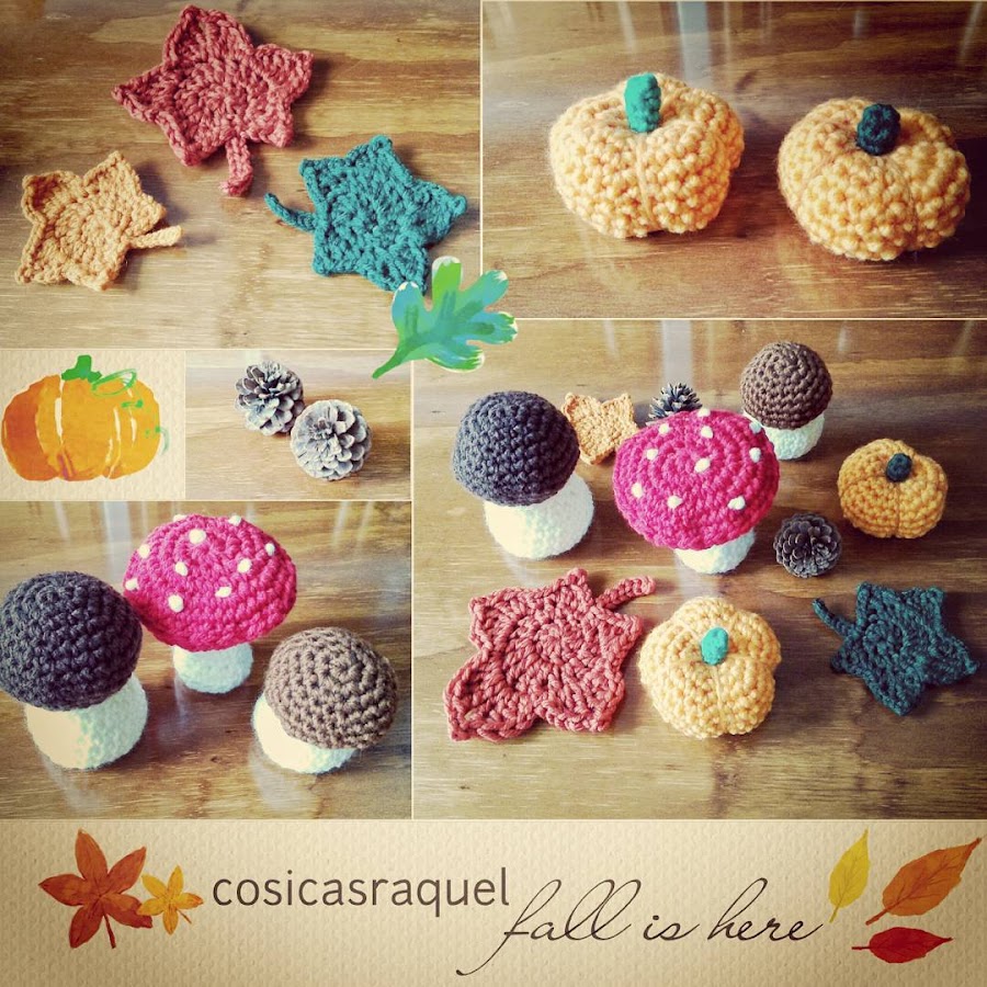 Y estas son las cositas que tenía ya ,el patrón de las hojas lo tienes en el blog http://cosicasraquel.blogspot.com.es/2014/11/hojas-de-otono-crochet.html , las calabazas y las setas las saqué de internet pero no me acuerdo exactamente de donde si estas muy interesada lo puedo buscar sólo tienes que decirme