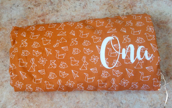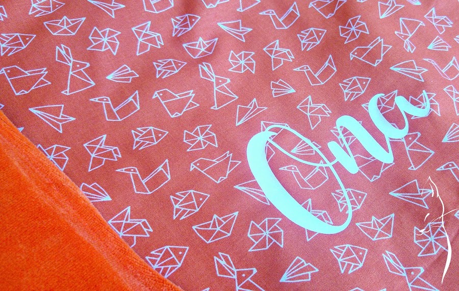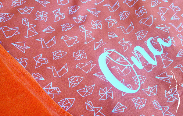 Exterior de tela de origami color anaranjado con los dibujos blancos; la parte posterior de velour naranja, suave y cálido pero a la vez ligero.