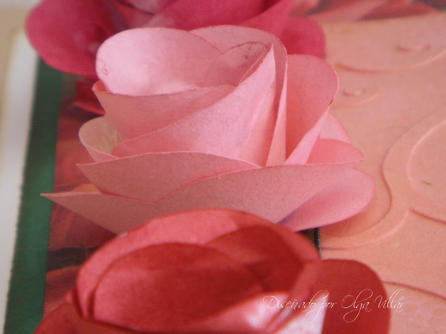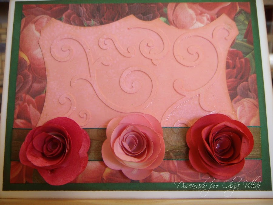 Para elaborarlo, he utilizado cartulinas color rosa, verde y blanca. El relieve de los arabescos están hechos con la técnica de falso embosado creando arabescos del mismo color y capa de Mod Pogde brillante.
