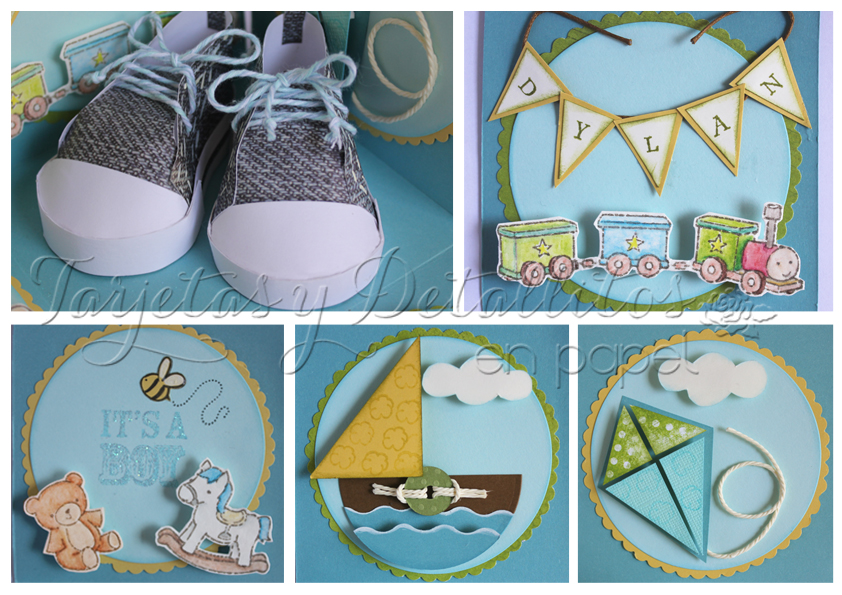 y finalmente, los detalles. Unos zapatos deportivos de una marca conocida por los jóvenes, usando un papel con diseño de jean; a la derecha un banderin con el nombre del pequeño y el tren de la colección de sellos Lawn Fawn: Pam-rum-pa-pum-pum; abajo a la izquierda el mensaje: "es un varón" con detalles de los mismos sellos; al centro una silueta de barco hecha con formas básicas y a la derecha, una cometa (o papagayo, como le decimos en Venezuela)