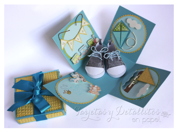 y finalmente, los detalles. Unos zapatos deportivos de una marca conocida por los jóvenes, usando un papel con diseño de jean; a la derecha un banderin con el nombre del pequeño y el tren de la colección de sellos Lawn Fawn: Pam-rum-pa-pum-pum; abajo a la izquierda el mensaje: "es un varón" con detalles de los mismos sellos; al centro una silueta de barco hecha con formas básicas y a la derecha, una cometa (o papagayo, como le decimos en Venezuela)