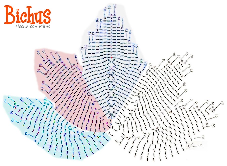 4- He destacado con colores las zonas por las que iremos tejiendo para facilitar el armado de la hoja comenzamos por el centro, luego tejemos las partes laterales.