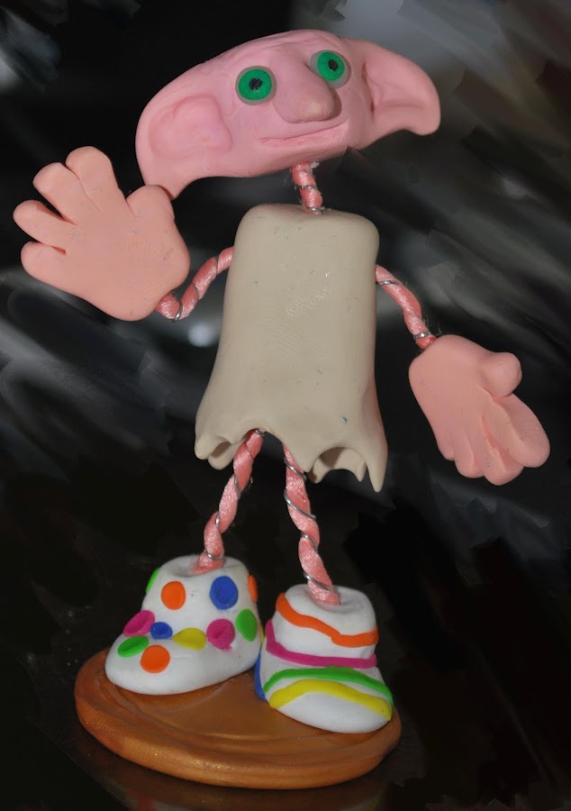 Como por ejemplo, este Dobby con calcetines de colorines y disparejos, hecho con fimo, y que os saluda desde aquí al lado.