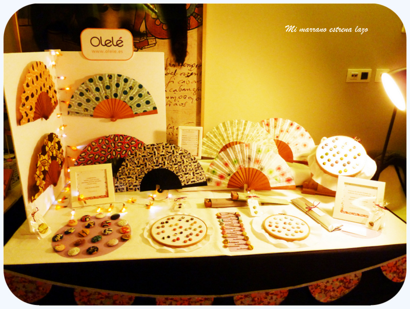 A mi derecha estaba Karmele y sus abanicos artesanales, un placer conocerla, de ella aprendí también unas cuantas cosas, otro amor de artesana, no podía haber tenido mejores "vecinas" de puesto. Sus abanicos de telas preciosas me parecieron un trabajo impresionante, así que ya sabéis si os gustan sus abanicos, no os olvidéis de ver su tienda Olele.