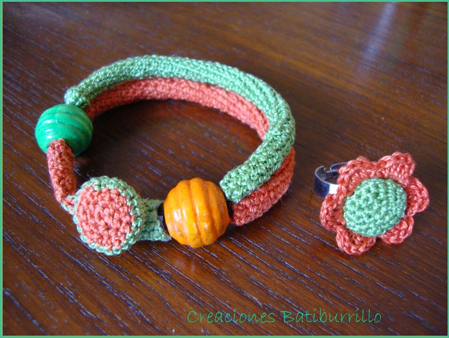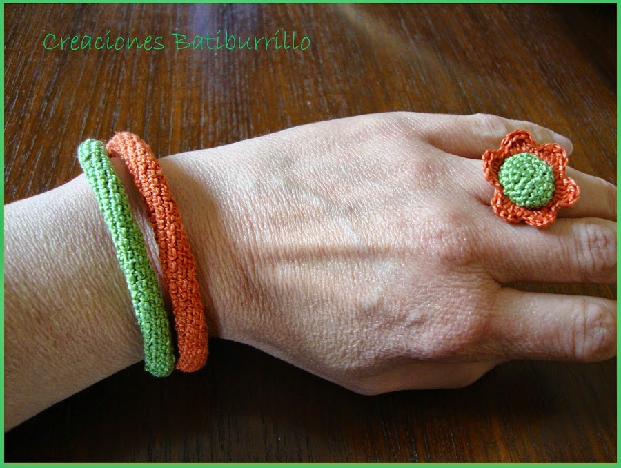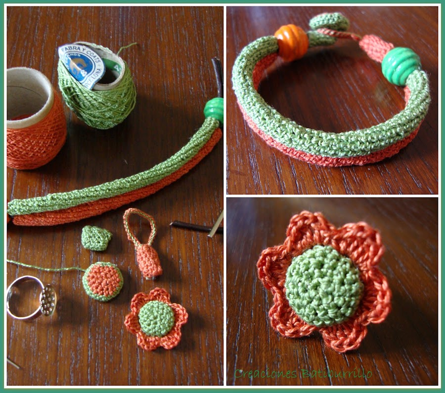 De nuevo la base de la pulsera, igual que en la garantilla, son dos formaciones tubulares tejidas con paciencia de forma cilíndrica sobre 7 puntos. Están montadas sobre dos trozos de cordón plastificado de bisutería (para introducirlo metemos primero el ganchillo o un palillo de brocheta y por detrás vamos empujando el cordón. Así, el palillo, al ser rígido va abriendo camino al cordón para que pase sin doblarse y atascarse por enganchones en el tejido).