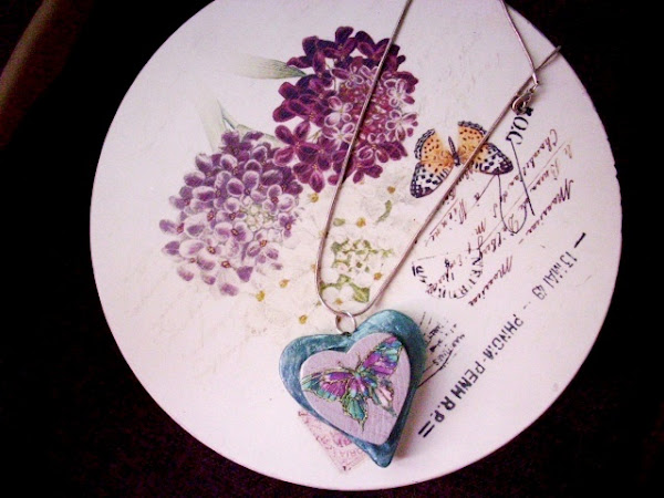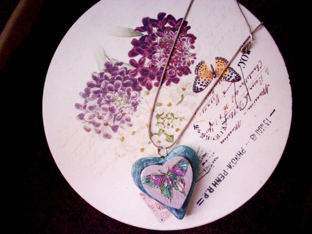 Sobre el corazón de madera mariposa con técnica decoupage.