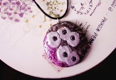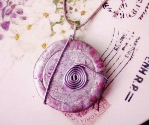 Son dos círculos de arcilla superpuestos, va pintada en tonos lilas, igual tono que el hilo de acero utilizado.