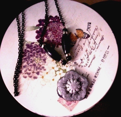Pieza plateada en forma de flor. Cuentas redondas y alargadas en resina. Tonos plateado y negro.