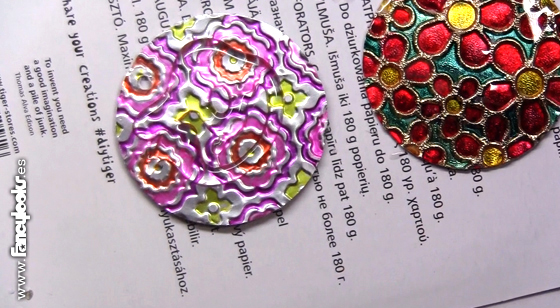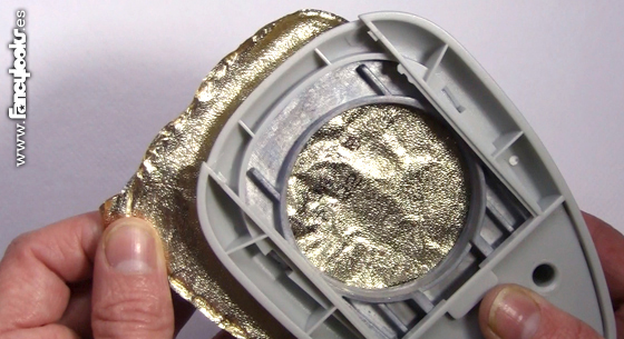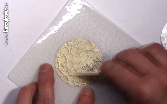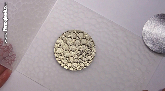 Coloco uno de los círculos con la parte dorada hacia arriba en un "embossing folder", o carpeta de relieve, de esas que se usan para scrapbooking con la Big Shot, máquina que en este caso no nos hace falta. Con la misma espátula de plegado o palito de helado le vamos frotando y apretando por toda la chapita de aluminio para que quede marcada con el relieve al máximo. Al ser aluminio marcará muy bien y fácilmente. Coloco el otro de los círculos en el "embossing folder" con el lado plateado para arriba y vuelvo a marcar con el palo.