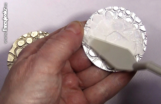 Ahora que tenemos ya bien bonitos los dos lados del medallón, hay que rellenarlos y pegarlos. Para eso uso una pasta de relieve casera que explico cómo hacer en este video-tutorial. Con una espátula, extiende una fina capa sobre el lado de atrás, rellenando bien los surcos del relieve y luego une ambos círculos por sus reveses. La pasta de relieve los pegará y hará, una vez seca, que mantengan su bonito relieve alzado y no ceda a la presión.