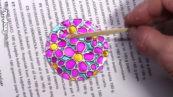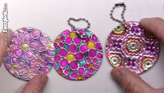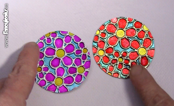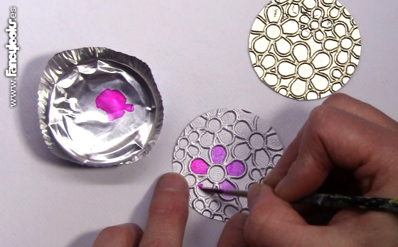 Lleno de color las partes del relieve que están hundidas, dejando los bordes alzados del dibujo sin pintar, para que en ellos quede visible el color de la tapa, por eso uso un lado dorado y el otro lado plateado, para variar el color de las dos caras del medallón.