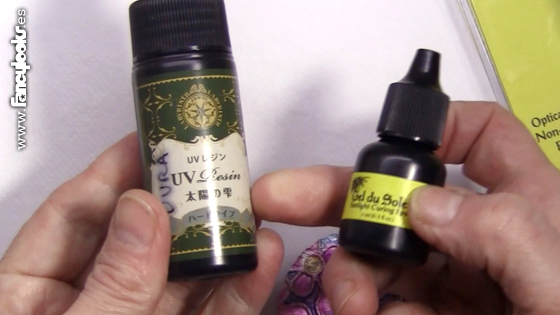 Para cubrir esta decoración voy a usar resina UV o resina que cura con los rayos del sol o rayos UV. Utilizo de dos marcas, una que ya no puedo conseguir, que es francesa, Gel du Soleil, y otra de una marca japonesa, Padico, las dos dan muy buenos resultados.