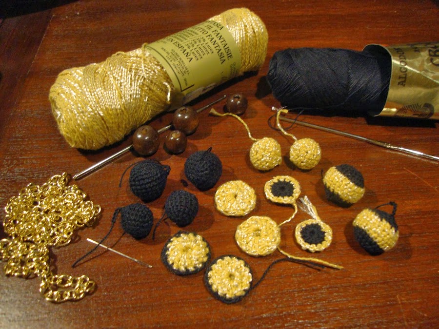 Las esferas son abalorios de madera recubiertos de ganchillo, como empleé abalorios de dos tamaños diferentes y el crochet negro también es más fino (nº8) que el dorado (nº5), tuve que ir adaptando los puntos necesarios para cubrirlos a medida que hacía las formas.