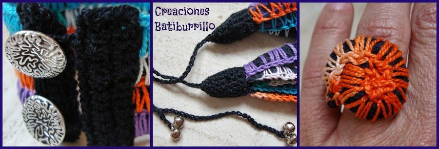 Vamos cubriendo con el crochet las tiras de tela (que cortaremos de diferentes longitudes para que caigan en el collar en cascada) igual que cuando os enseñaba a cubrir aros. Podéis verlo en las fotos o repasar el vídeo tutorial AQUÍ