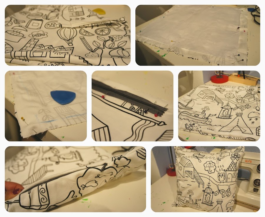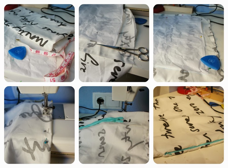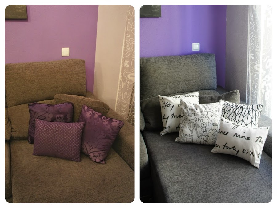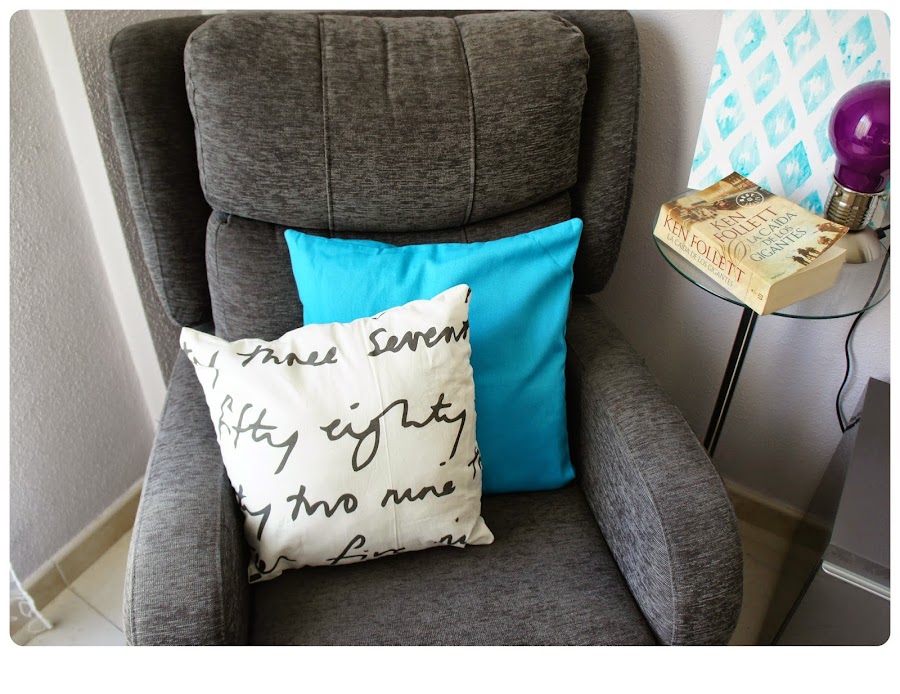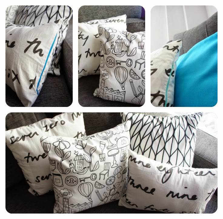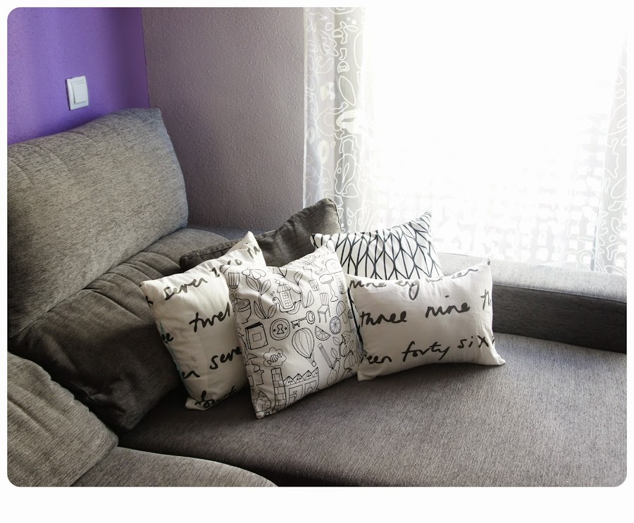 Una buena idea para cambiar el aspecto de tu salón por muy pocos euros es hacerte tus propios cojines. Para aportar luz escogí telas con fondo blanco y para añadir el toque de color puse algunas de las cremalleras en tonos azules.