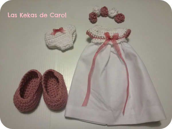 En este caso lleva un vestido con cuerpo de crochet, y el vestido es de tela de organza, en color blanco con detalles en rosa antiguo.