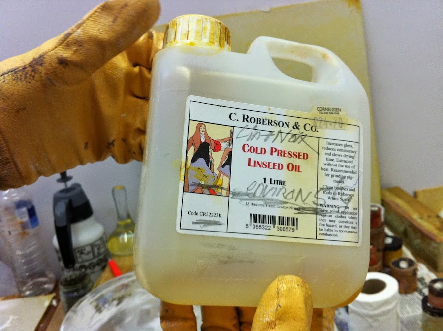 A continuación, añadir el aceite de su elección. Los mejores aceites son realmente de linaza y nuez, ya que se oxidan en la forma más estable y tener la mejor adherencia. Juan utiliza un 50% de mezcla de 50% de linaza y nuez el tipo de calidad que usted puede encontrar en lugares como Atlantis Artes fuera Brick Lane (tubo para obtener Whitechapel o de superficie a Shoreditch). Un poco de agua estará presente pero será dissapate del aceite que se adhiere al polvo. Así que ahora usted tiene una gloop blanco interesante con aceite y misciblity agua.
