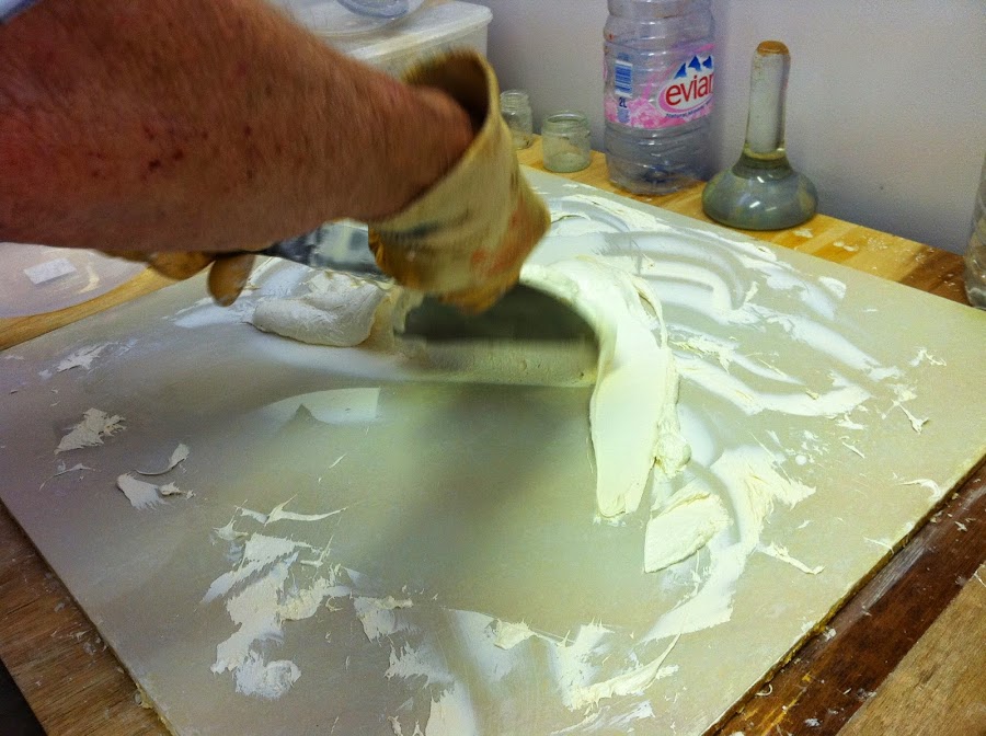 Ahora transferir a una superficie de trabajo de mármol / piedra. Digo esto porque el tipo que tiene que ser a prueba de agua y de la piedra es muy resistente e inerte. No estoy seguro de qué efecto una superficie de plástico tendría pero quedo mejor que algo que se puede limpiar fácilmente. Ahora tiene que mezclar con un tipo especial de cuchillo de paleta hemisférica, o incluso una gran raspador para quitar el papel pintado sería bueno. Usted mezcla tanto como lo haría para hacer grandes cantidades de azúcar en polvo o pasta de pan (sólo está utilizando una herramienta en lugar de las manos). Raspe la mezcla junto a continuación, pulse la espátula contra la mezcla y sacar de él hacia usted en grandes movimientos de barrido.