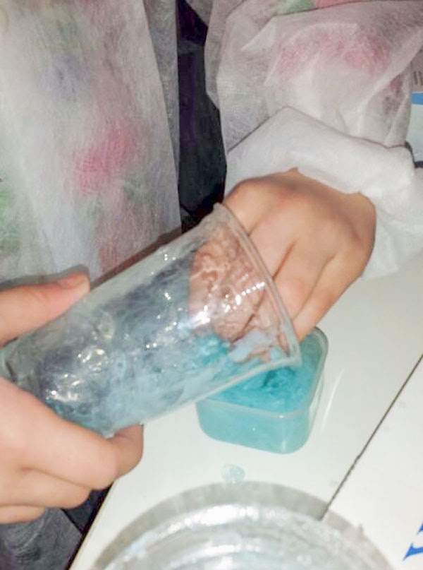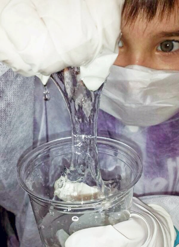 La mezcla es 3 partes de disolución de alcohol polivinílico por una parte de disolución de bórax. No hace falta ser muy exactos, funciona igualmente.
