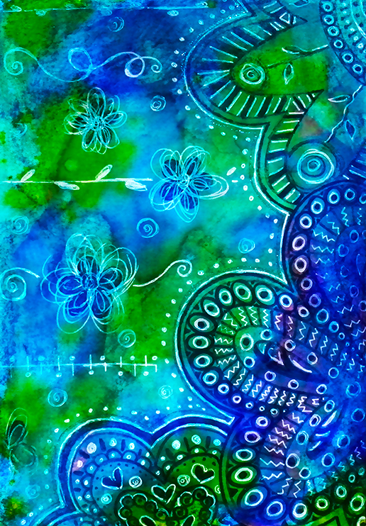 El fondo del dibujo está trabajado con acuarela líquida haciendo aguadas y, una vez seco, un toque de ceras de color, también acuarelables. Después de esperar unas horas a que tota la humedad se haya ido (tened en cuenta que el papel de acuarela es capaz de absorber mucha agua y no se estropea), hemos hecho el dibujo propiamente dicho, con un rotulador de color azul y toques de rotulador blanco para dar luz y vida a todo el conjunto.